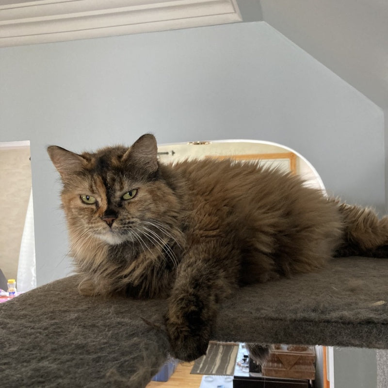 Craintive avec les étrangers, elle préférait observer la vie familiale depuis le plateau le plus haut de son arbre à chat.